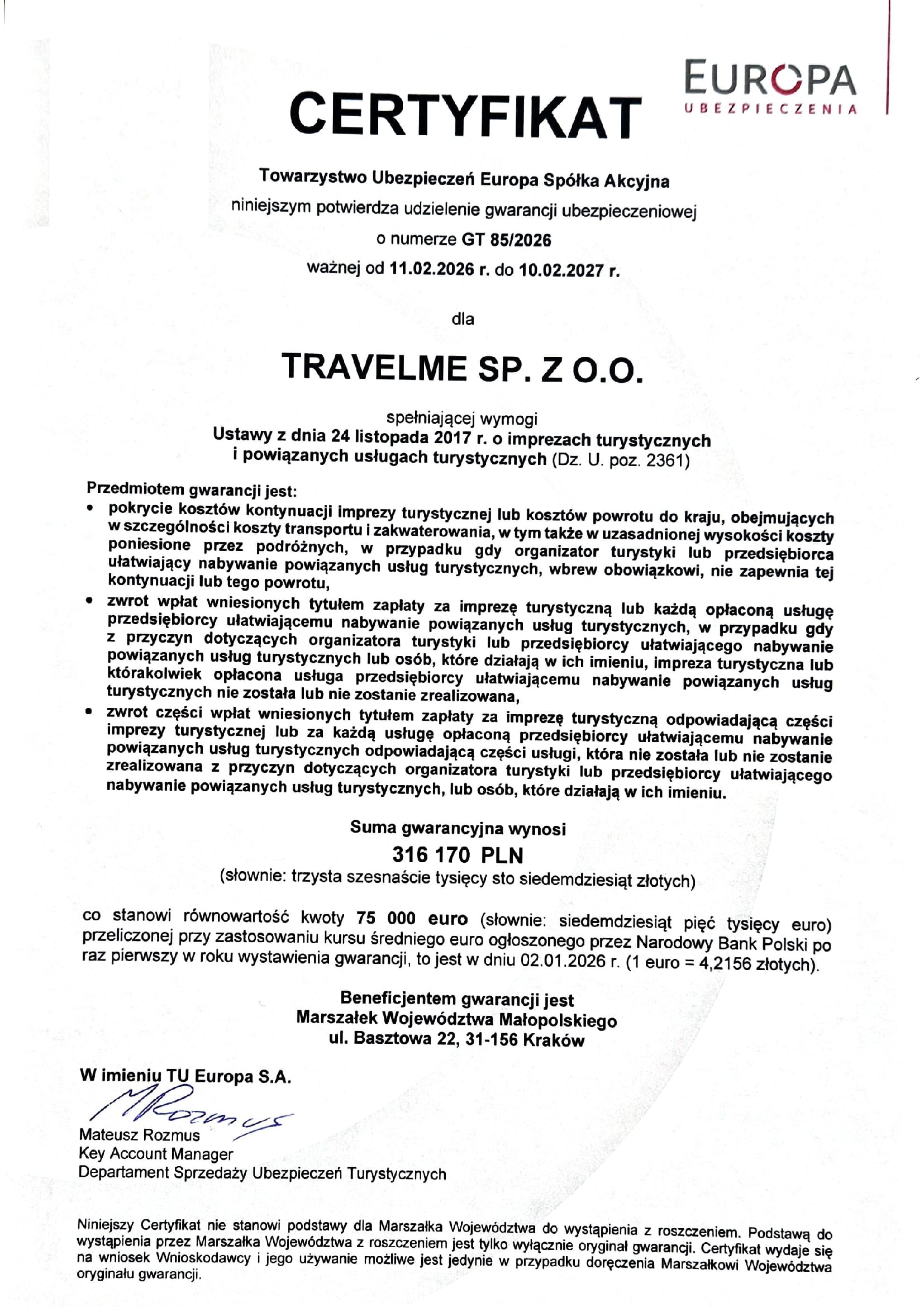 TravelMe jest zarejestrowanym biurem podróży i touroperatorem przez Marszałka Województwa Małopolskiego oraz posiada gwarancję ubezpieczeniową o wartości 316 170 zł wydaną przez TU Europa S.A.